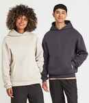 70% ringspun cotton/30% recycled polyester.* Cotton faced fabric. Brushed back fleece. Drop shoulder style. Oversized fit. Three panel double fabric hood. Front pouch pocket with inner media pocket. Ribbed cuffs and hem. Twin needle stitching. Tear out label.