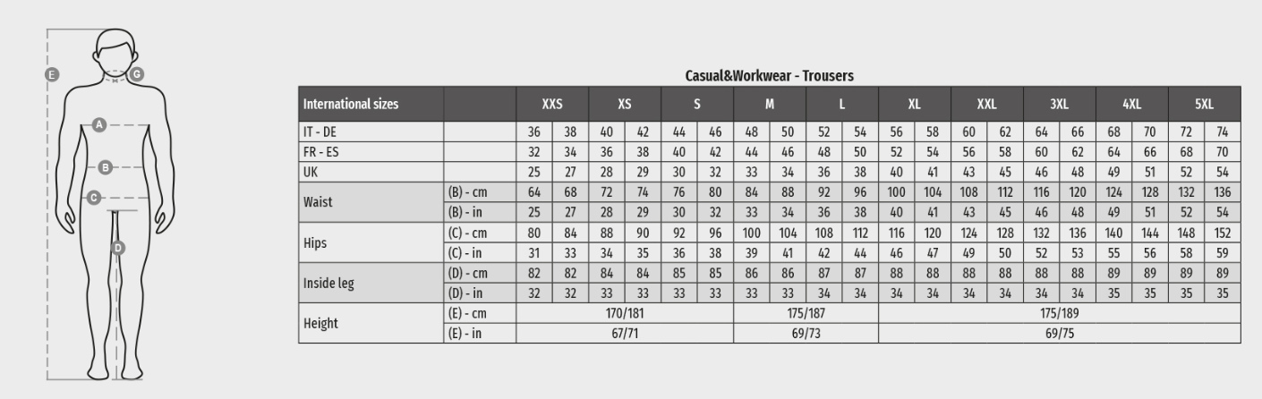 Unisex “4-way stretch” trousers with side elastics and belt loops, closure with zip and customised button. Two floating pockets in 500D Oxford Nylon inserted into the belt: one with a pen holder and tool band; one with a zip and pockets for storing tools. On the front they have two rounded pockets, a coin pocket on the right, a safety pocket with a zip on the left. On the front of the left leg there are 3 pockets: one horizontal with a zip fastening; one with a shaped flap with hook-and-loop fastener, equipped with a badge holder; a small vertical one with a zip fastening. A retroreflective stripe is visible on the right thigh. Both legs are equipped with a top-opening knee pad in Nylon Oxford 500D. On the back there are: a pocket with flap and hook-and-loop fastener, a hammer ring, an open tape measure pocket and a smartphone holder with flap and hook-and-loop fastener (right leg); an open pocket with two retroreflective stripes (left leg); retroreflective inserts at knee height and contrasting kick tapes for both legs. Side seam topstitching and contrasting bartack reinforcement stitching in various points. The middle (Italian) sizes 48-50-52 have an 82 cm regular internal leg length.